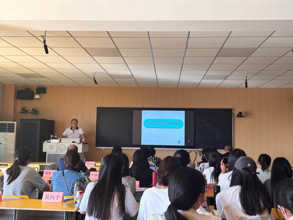 学校教学督导组成员李广臣教授作了题为《教师课堂教学基本技能》的专题讲座。李广臣教授重点从教学语言表达以及板书设计两方面展开讲授,通过示范朗诵《七律·长征》让教师们直观感受到课堂语言表达的重要性,在授课过程中应把握好语速,注意情感表达。李教授还就板书设计的基本原则与写好板书的要诀与教师们分享,明确板书技能是教师必备的基本技能,鼓励教师多写多练,充分运用到授课过程中。